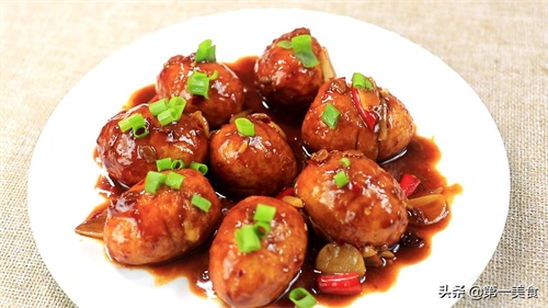 8分钟以后,把锅中的香料挑出来,转大火收一下汤汁,再勾入一些水淀粉。等把汤汁收成粘稠状时,淋入一点明油提亮色泽,就能出锅装盘了。最后把汤汁均匀浇在鸡蛋上面,再撒上葱花美味即成。