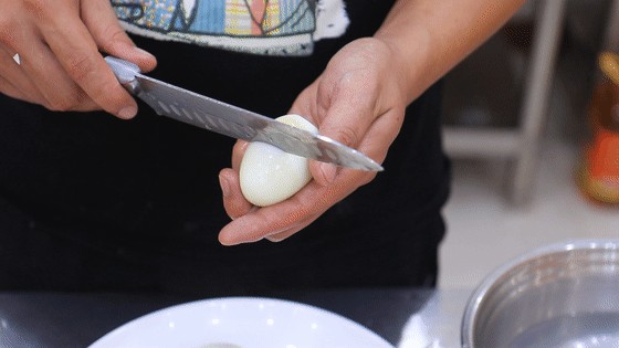 鸡蛋煮熟以后,我们把它捞出来放在凉水中来回搓几下,这样蛋壳很容易剥下来了。把鸡蛋剥好以后,在上面划上几刀方便味。另外再准备适量的淀粉,加入少许清水拌匀备用。