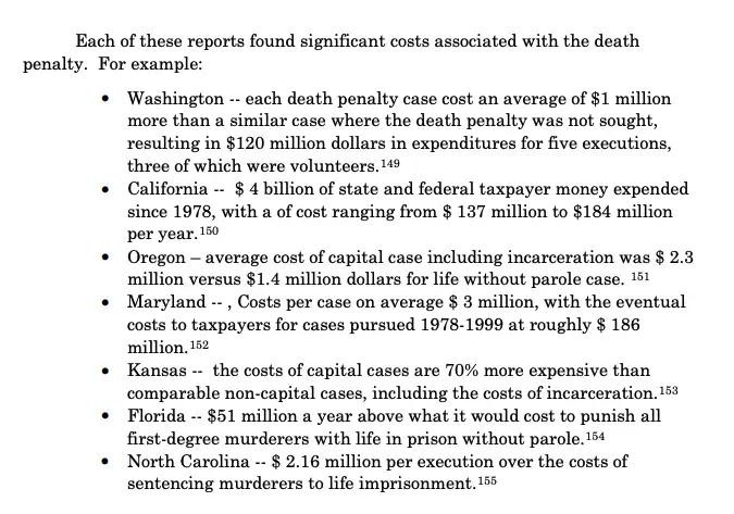 这份研究也提到了死刑比无期徒刑贵的现象。有数据表明,在佛罗里达州,若是取消对一级谋杀罪的死刑惩罚、代之以不允许假释的终身监禁,则每年可以省下 5100 万美元(佛罗里达州不养闲人,但其实养着他们更省钱);而在堪萨斯州,每例死刑要比终身监禁成本高出 70%,类似的数据在研究中还列举了好几条: