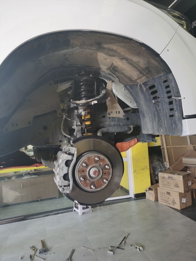 由于改装了前杠和绞盘,前弹簧被压下去两厘米,改装避震迫在眉睫,其实挺个两年没问题的,但是强迫症索性一次搞定,本来想换个博奋德的两次氮减,但是没货,而且用的是霸道通用尺寸,无法在h9上完美安装,要改上支臂和其他加强件,不然尺寸不对轮胎和弹簧会有摩擦。而且因为h9现在车还不是很多,改装件特别少,所以就先把钱留好,以后等大牌的减震出h9的专用减震再改氮减。正好ome大黄减出来了,先换个油减凑合用吧。减震+可调止推杆+两根加长油管安排!改完之后尺寸完美,没有多余冲突的地方。优点有很多,我觉得比较重要的就是解决了高速转弯车身侧倾的问题,缺点是比原车硬一点,但适应之后其实差不多。