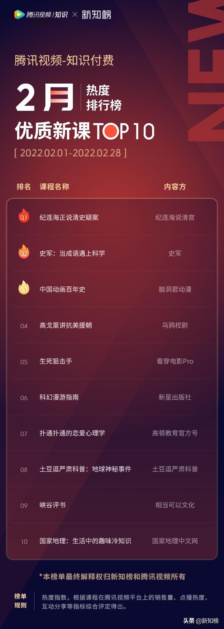 本期腾讯视频知识课程新课榜中,《纪连海正说清史疑案》《史军:当成语遇上科学》和《中国动画百年史》分别位居前三名。