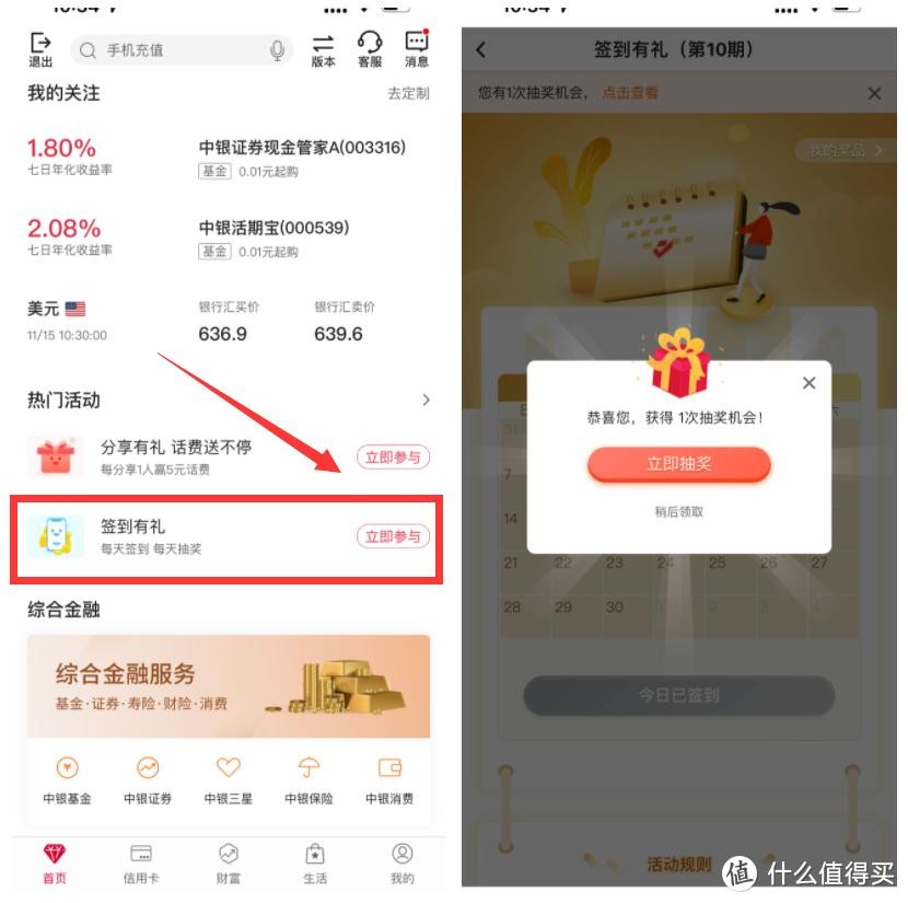 在中国银行手机App里面, 首页, 下面有一个签到有礼。 点击后续有一个立即抽奖。