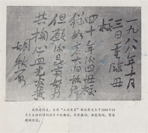 1988年10月3日,胡秋原重临阔别已久的母校武汉大学,并欣然题诗一首:“四十年后回母校,犹如老大归故乡。但愿后昆齐努力,共掬心血光炎黄。”