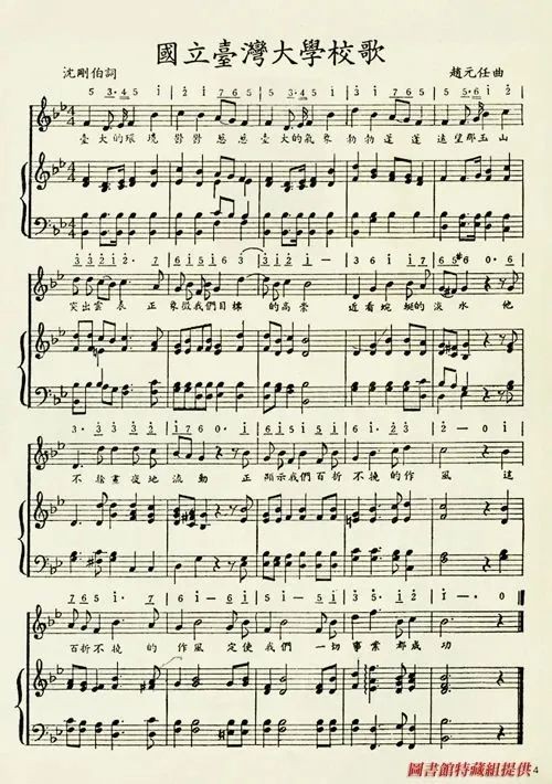 由沈刚伯作词(经多次修改)、赵元任谱曲的国立台湾大学校歌