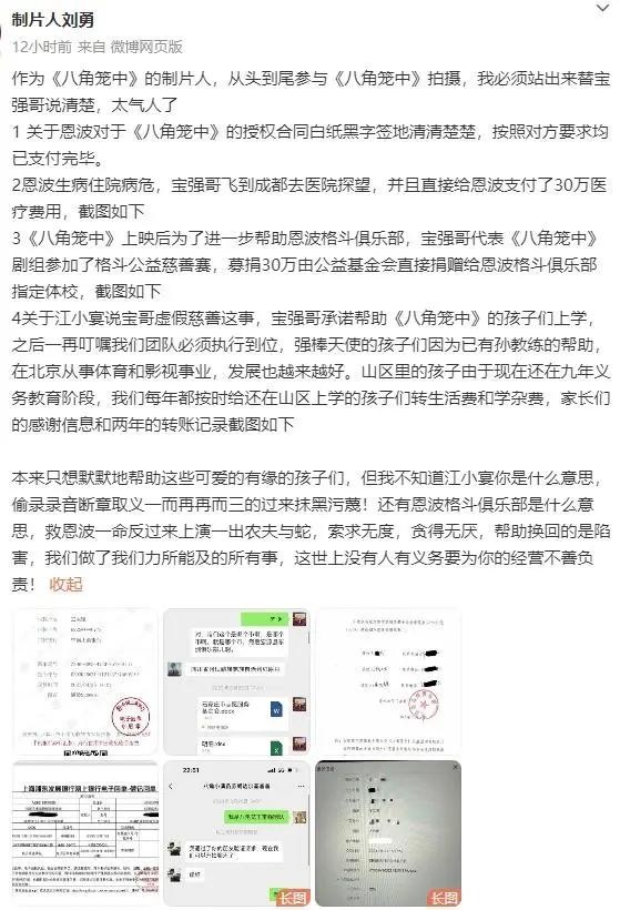 11月21日晚,夜深人静之时,《八角笼中》的制片人刘勇终于按捺不住内心的怒火,发声为好友王宝强正名。
