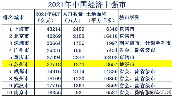 要了解昆山市,首先需要认识一下管辖它的苏州市。2021苏州市GDP总量22716亿元,在中国经济10强市中位列第6,而且苏州市是经济十强市中唯一一个普通的地级市,其它市全部是直辖市,省会副省级城市,计划单列市。苏州市是中国最强的地级市。