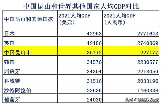 2021年昆山市的人均GDP放在全世界也是名列前茅的,昆山市的人均GDP比韩国西班牙葡萄牙这些传统的发达国家高,也比沙特阿拉伯,科威特这些产石油的土豪国家高。