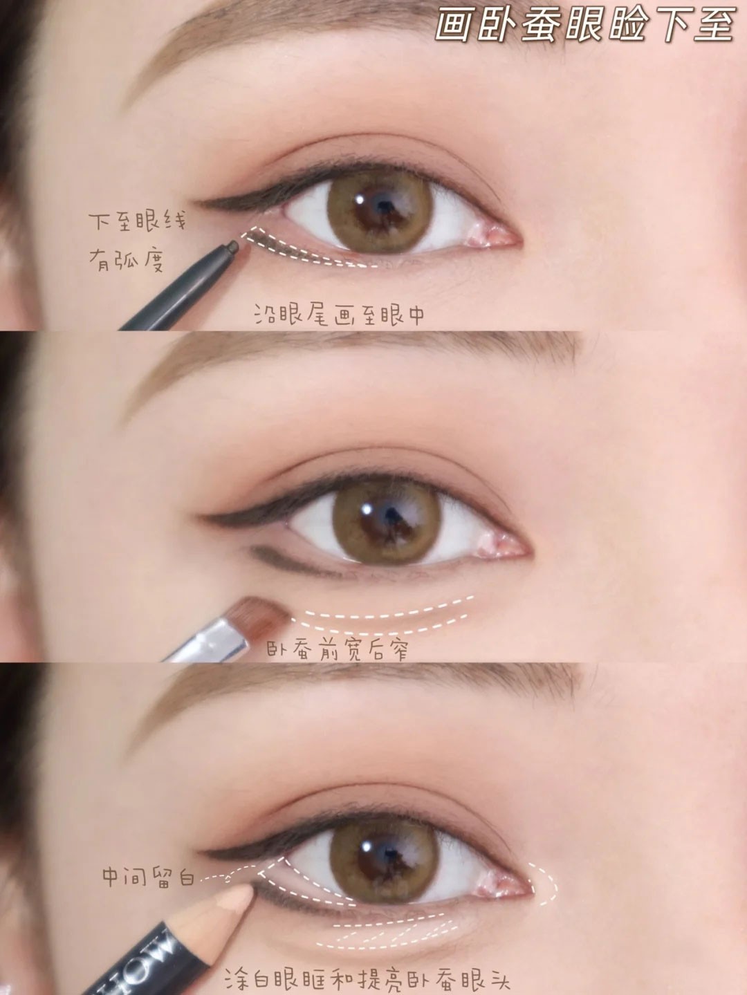 2、卧蚕前宽后窄,眼睑留白,提亮卧蚕和眼头