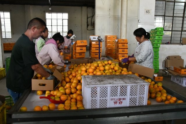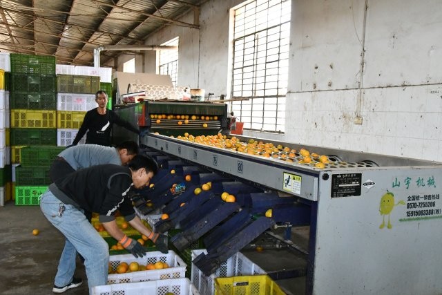 在牛山柑橘交易市场内,智能分选机高效运作,工人们正忙着对新鲜冰糖橙进行分选、称重、打包等流水线作业。前来选购鲜果的采购者络绎不绝。