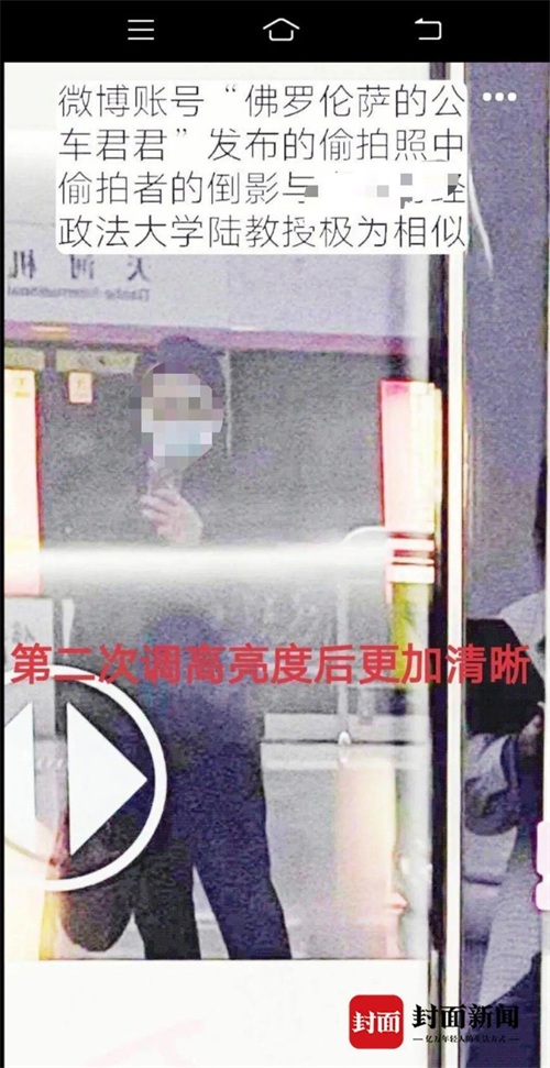 网友称,该账号的行踪轨迹和湖北某政法大学的民商法副教授陆某的出差轨迹吻合,时间一致,且偷拍照片中,“偷拍者在玻璃上的倒影与陆教授本人也十分相似”。