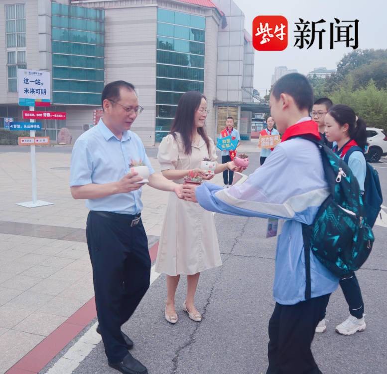 镇江实验学校以美丽的姿态和饱满的热情,欢迎同学们的归来。初中部的同学们,从臧翔等校领导以及老师们手中,接过象征“萌新”的绿植和学校印记的定制书签,一个个惊喜不已!