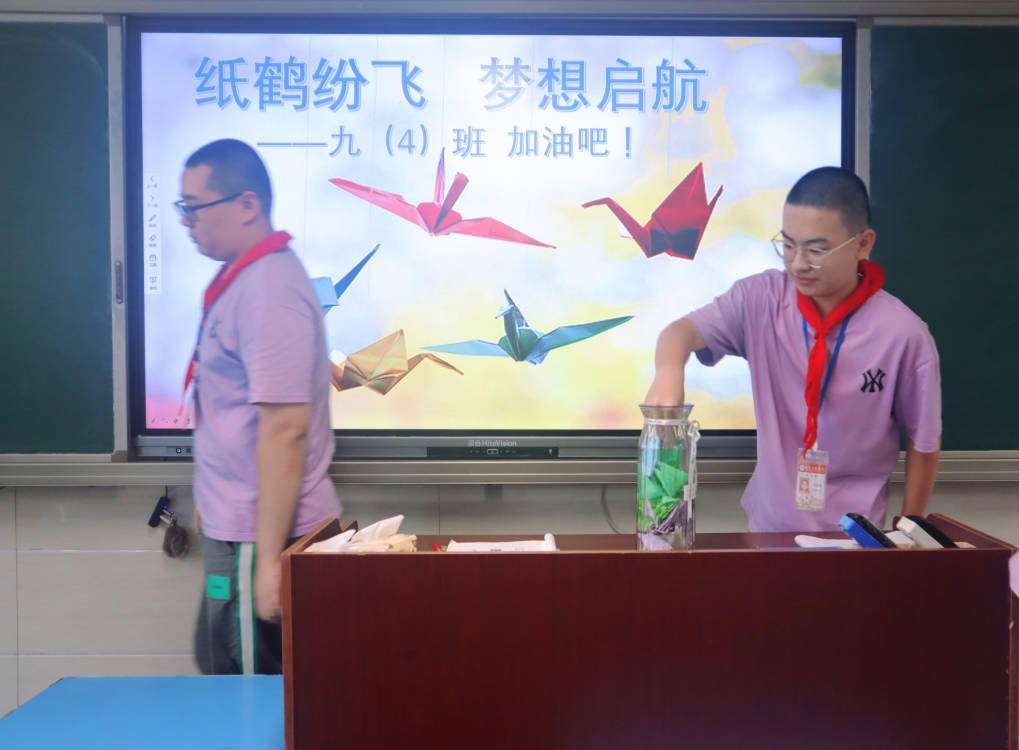 在九(4)班的教室里,一场新学期“心愿纸鹤”的活动正在进行。同学们一笔一划写下自己新学期的心愿,叠成千纸鹤,投入晶莹的许愿瓶中,预示快乐成长,静待梦想起飞!