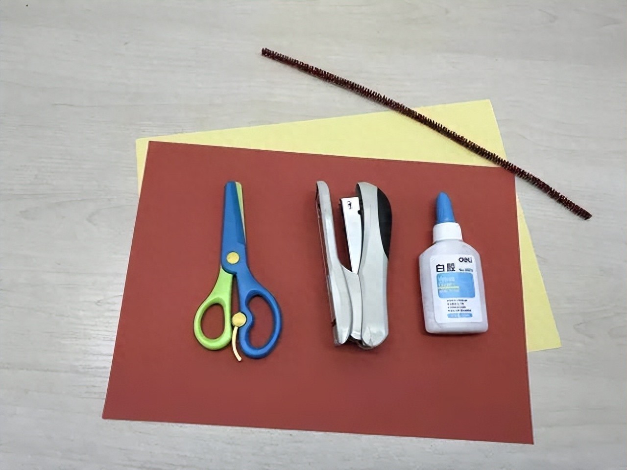 订书机1个,白乳胶或胶棒、红色毛根各1个。