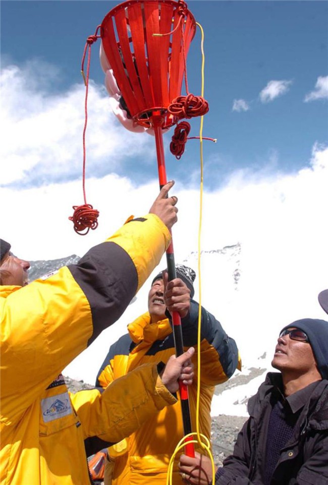 2005年5月19日,珠峰高程测量登山队员再次在海拔6500米的前进营地学习测量仪器的安装固定方法。新华社记者索朗罗布摄