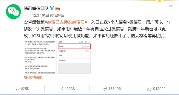 而在今天(2020年6月5日),腾讯微信团队在微博发布了消息:安卓最新版微信已可以支持修改微信号。