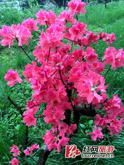 大围山栗木桥景区向上至樱花谷、红莲寺景区道路两旁的杜鹃花均已绽放。