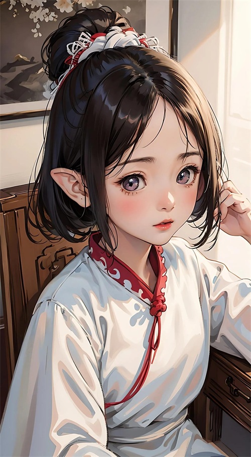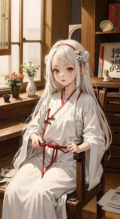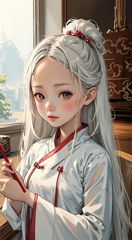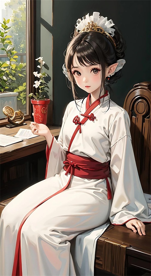不同系列女生头像图片,高清不模糊壁画图片。穿着白色汉服,不同风格的头饰,白色头纱,红色发圈,白色长发,棕色头发,樱桃小嘴,精致妆容很可爱的一个小女孩,大大的眼睛,棕色眼瞳,长着一张漂亮的圆脸。她优雅的坐在书桌前仰望着天空,眼神自信,复古型古色古香。