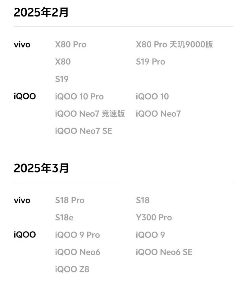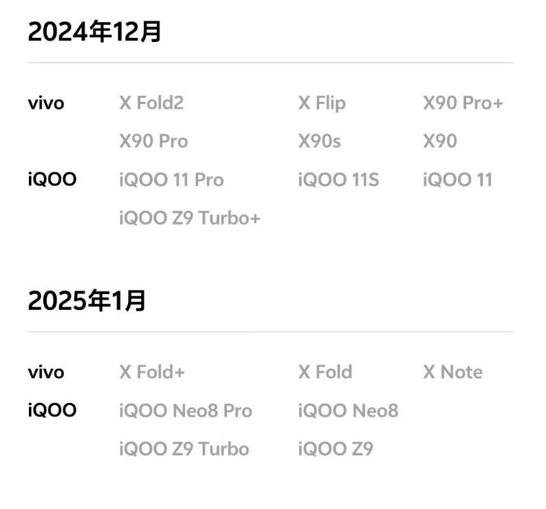 但最新发布的iQOOz9turbo+就要到12月份才能升级。那么一直到明年,也就是2025年的3月份,很多机型比如vivos18系列和iQOO9系列都可以正常升级。