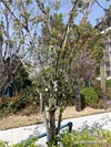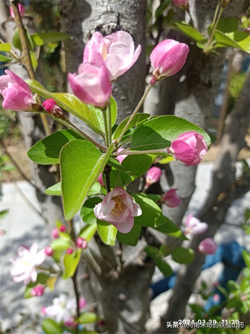 第三个花是海棠花。很高大的树上。开着粉红的颜色。