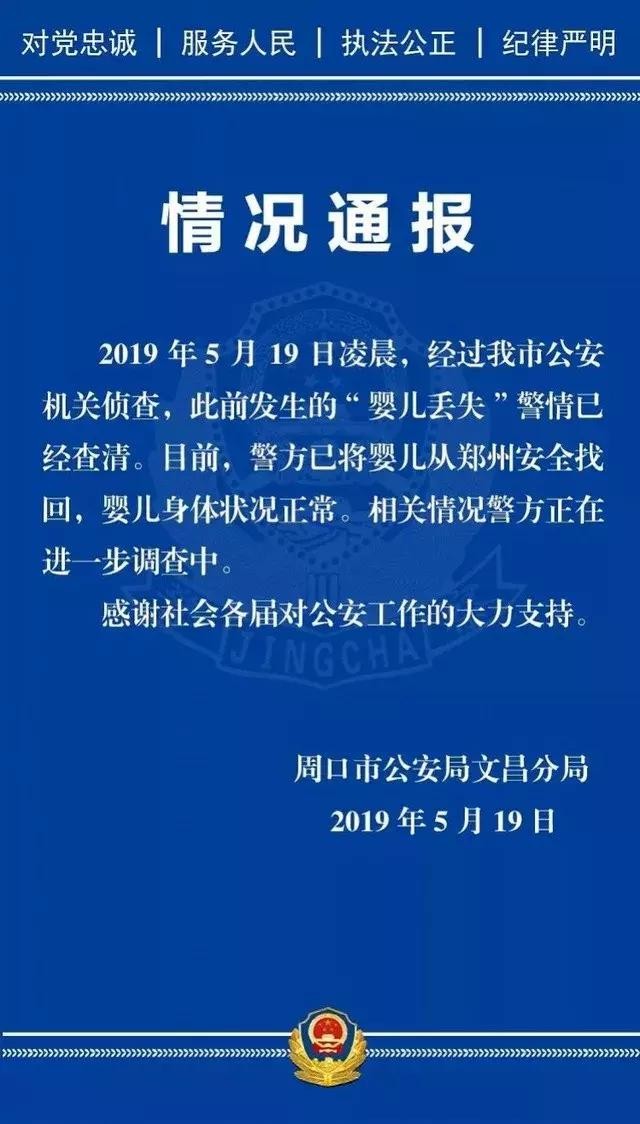 2019年5月19日凌晨,经过河南省周口市公安机关侦查,此前发生的“婴儿丢失”警情已经查清。目前,警方已将婴儿从河南省郑州市安全找回,婴儿身体状况正常。