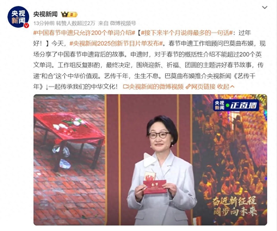 近日,春节申遗工作组顾问巴莫曲布嫫,分享了中国春节申遗背后的故事。