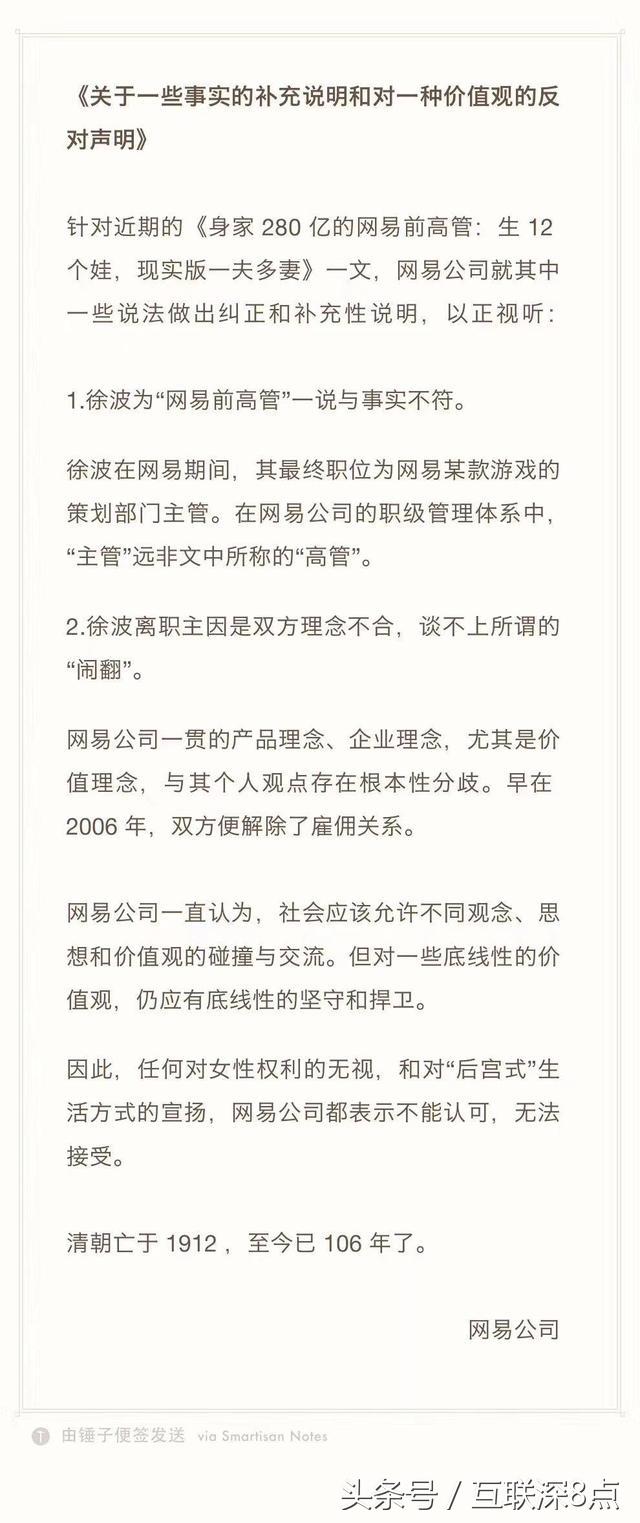 在细看网易声明后,会发现,所有的言语都是针对徐波的,而徐波的声明则或多或少的夹带了不少的私货。无论是从发布声明的ID,还是字里行间,都不断地提到多益网络公司。另外,无论是从语法的角度、还是从代称的角度,一会儿代表本人,一会儿代表本公司,落款又是公司董事长徐波的声明,还是让人怀疑这个徐波的学历真的可能就是初中。更值得玩味的是,在这件事曝光之前,人们对于这位神秘的隐形富豪知之甚少。原本只是坊间流传的一篇自媒体爆文——《身家280亿的网易前高管:生12个娃,现实版一夫多妻》,有了网易的推波助澜,这个神秘富豪突然上了热搜。到底这个微博是不是徐波的,至少徐波的这波热点是上了,多益网络的知名度也上来了。