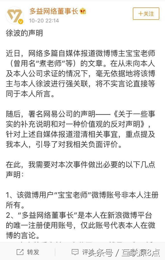 针对网易指名道姓的这个声明,徐波也迅速反应,写了一篇声明以多益网络董事长的网络ID发布,署名为多益网络董事长徐波。声明中徐波强调,该微博用户“宝宝老师”微博账号非本人注册所有,“多益网络董事长”是本人在新浪微博平台的唯一注册使用账号,仅此账号代表本人在微博的言论。对于网易在参与本次网文诽谤本人事件中,误导大众本人主张一夫多妻的“声明”,对此表示愤怒和强烈谴责。