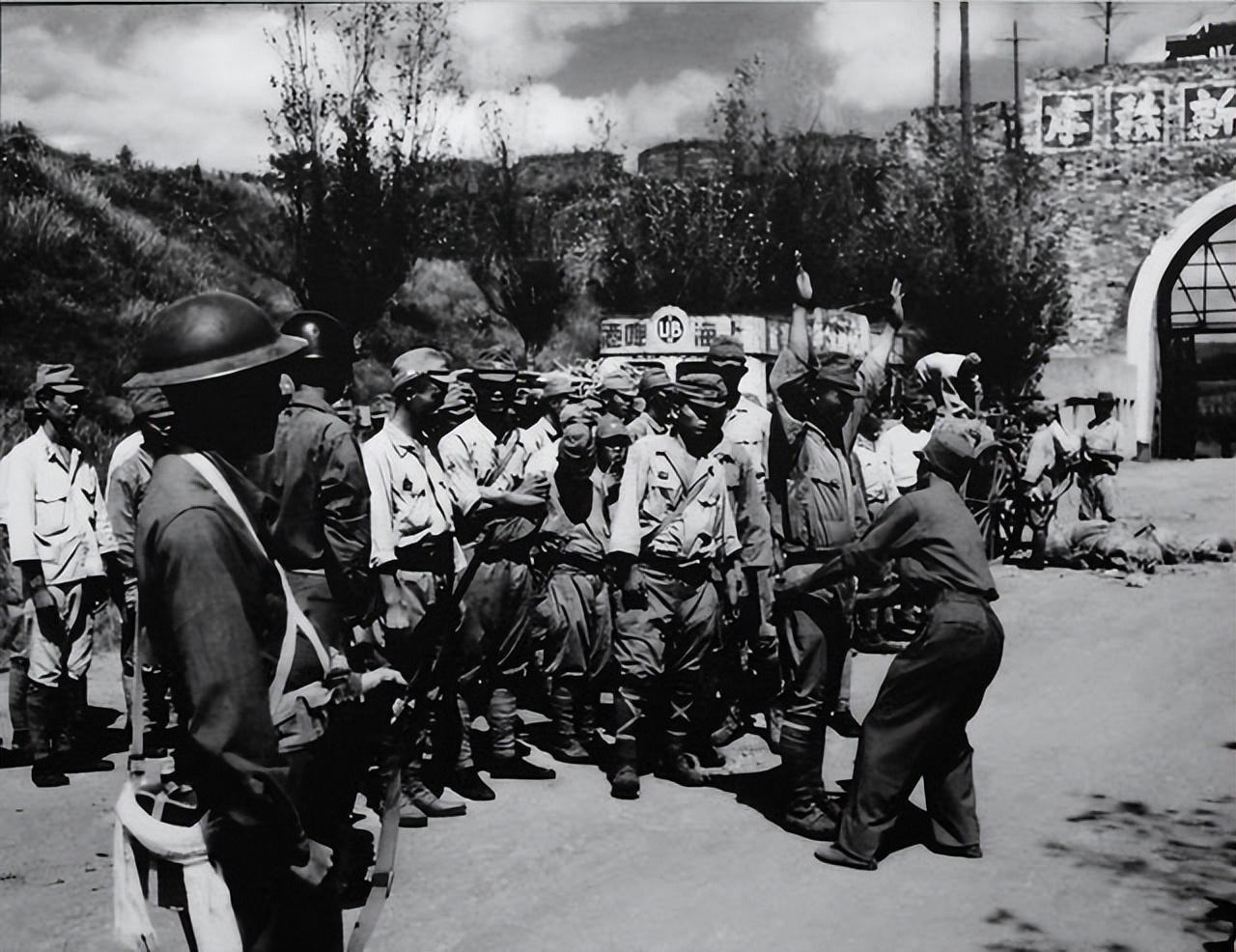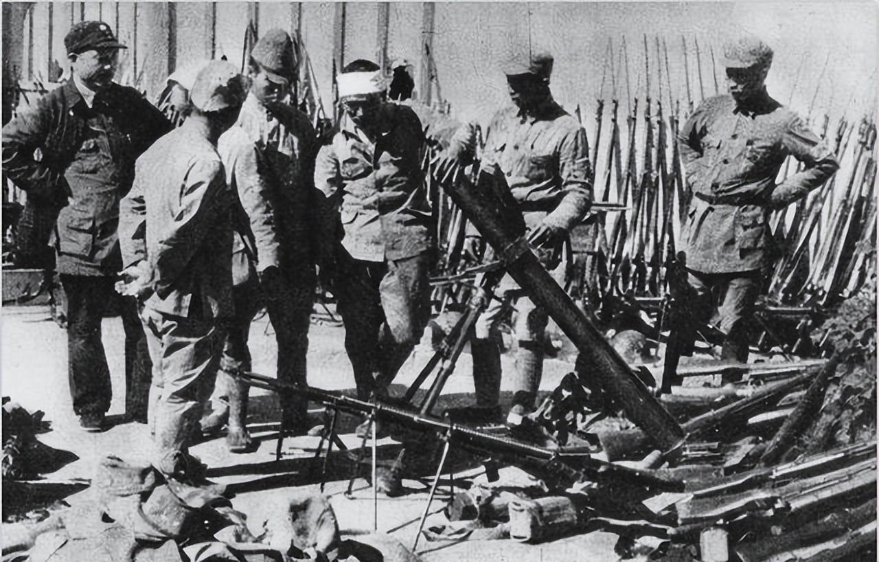 日本部队根据当时的规则,立刻缴械投降中国部队。中国部队在此,八路军也在其中。这是一幅日本人在1945年投降八路军时的画面。