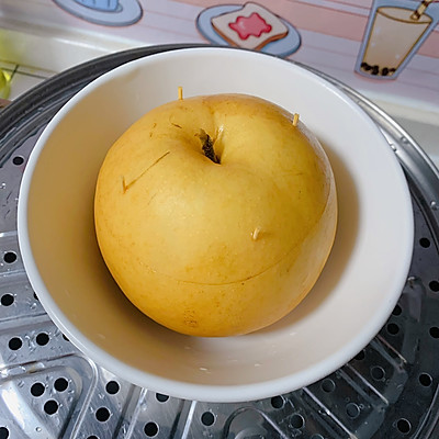 7、把梨放在碗中 上锅蒸制 一定要放在碗里 因为会蒸出梨汤 梨汤也很好喝哦 ~