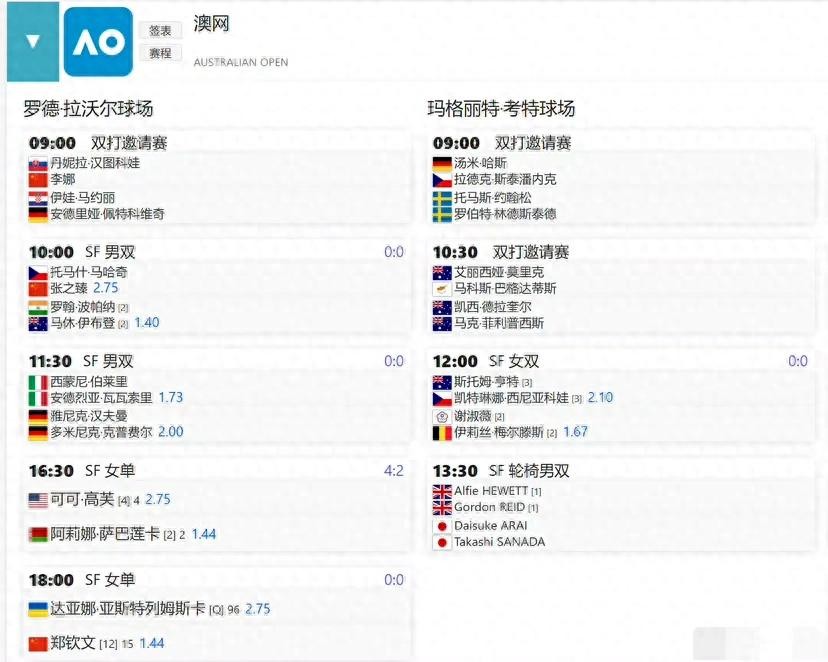 最新澳网赛程表!附澳网女单半决赛对阵表!男双半决赛对阵时间表