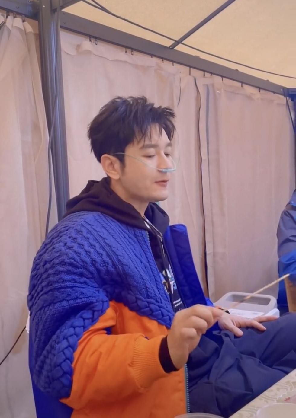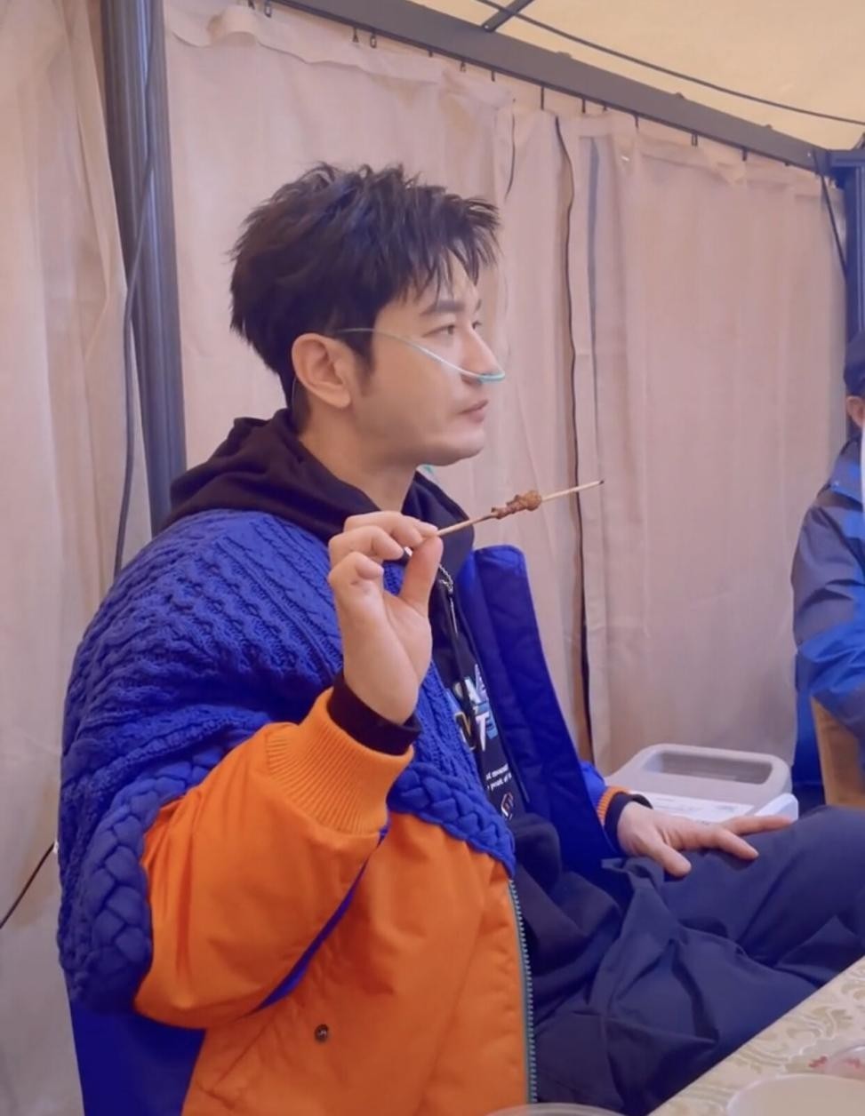 即便是戴着呼吸机,他还是在坚持吃饭,吃烤串的时候精神状态还是很不错的,并没有特别憔悴的感觉。也许是因为在高原地区拍摄新片,或者录制综艺,毕竟从他所在的背景来看,并不是在医院里。