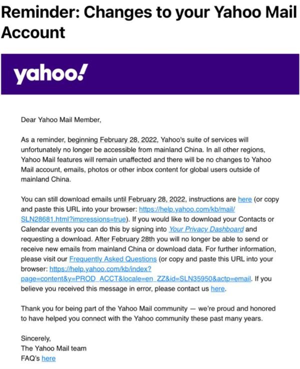 近日,许多雅虎邮箱用户收到了来自雅虎Yahoo官方发出的通知邮件:雅虎邮箱将在2月28日停止中国大陆地区服务,2月28日前用户可下载备份通讯录、日程等内容;2月28日后,用户无法再从中国大陆接收或者发送电子邮件。