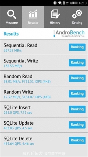 AndroBench中对于内存读取速度的测试,267.52 MB/s Read 与 138.53 MB/s Write,基本上已经确定是EMMC的闪存类型。