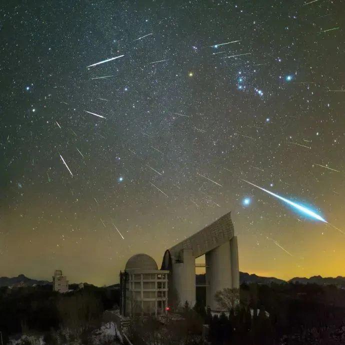 双子座流星雨,从每年12月7日活跃到17日前后,极大期则出现在每年的12月14日前后。极大时理论上每小时可以出现超过100颗流星,近年来更是经常超过150颗。这些流星看起来都像是从双子座头部射出,因而得名双子座流星雨。下图就是2015年我在国家天文台兴隆观测站拍摄的,可以看到无数流星都像是从同一位置射出。