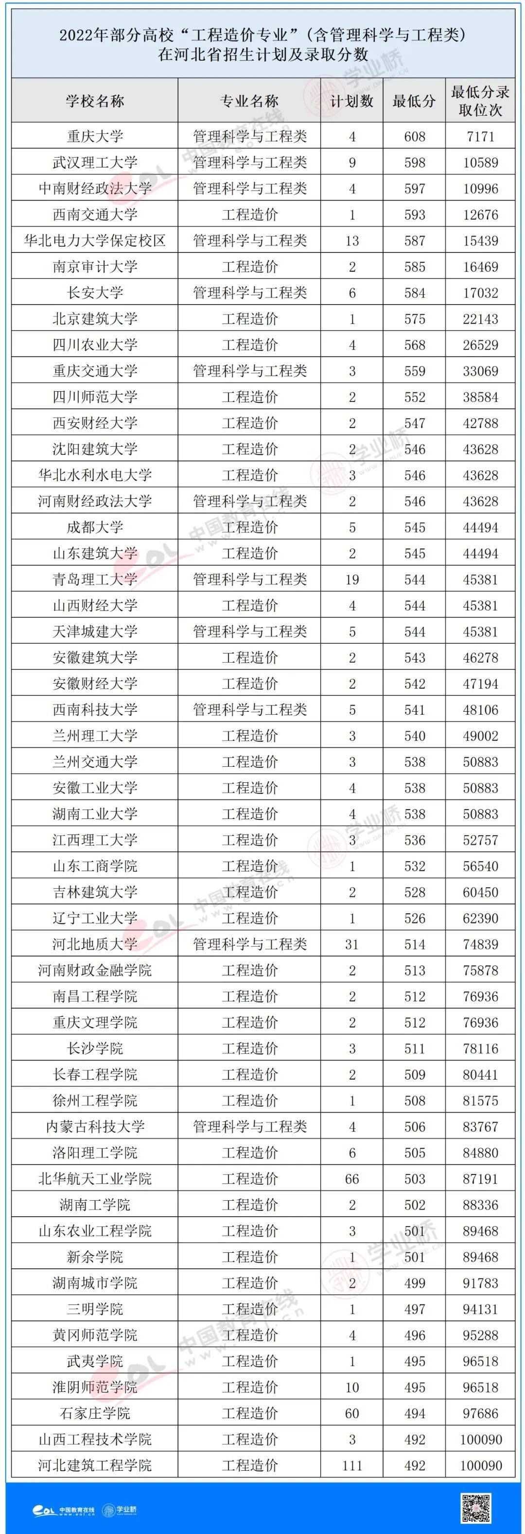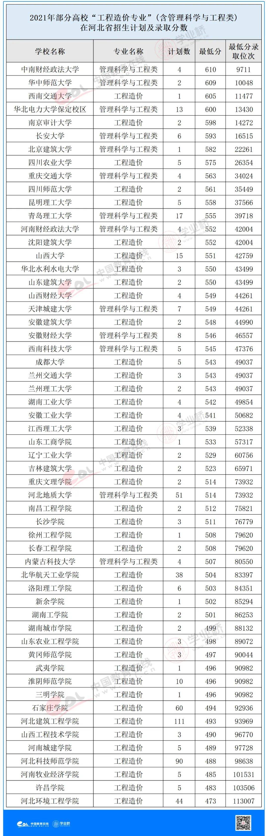 学业桥整理了2025年和2025年50所本科高校“工程造价专业”(含管理科学与工程类)在河北省招生计划及录取分数,看看考多少分可以读该专业。