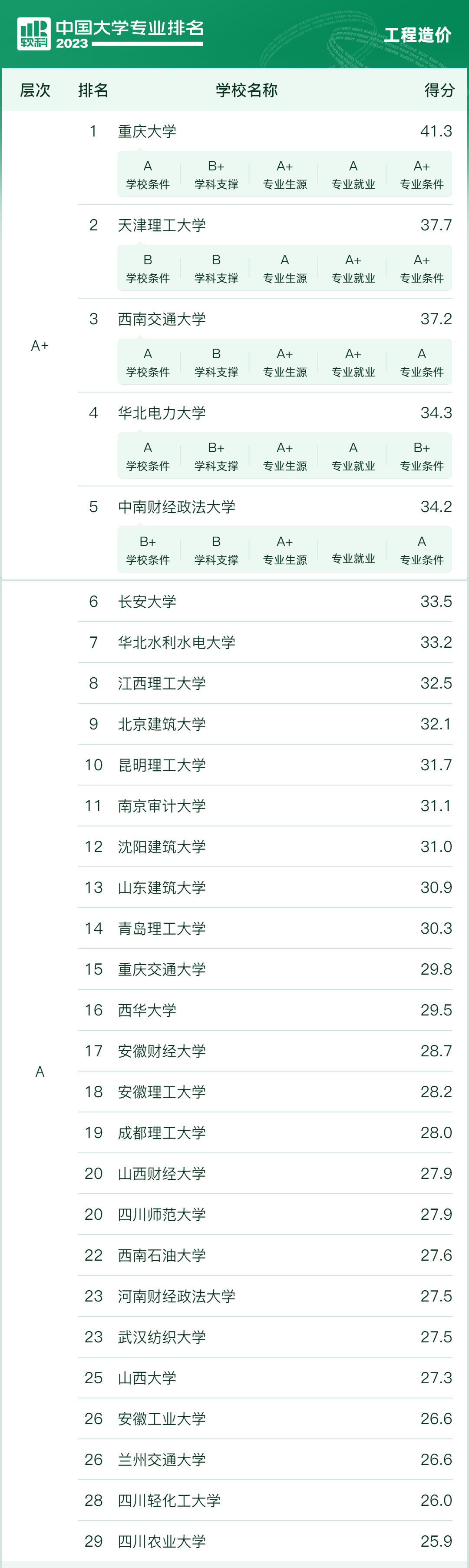 此外,同学们报考时,可参考软科发布的“2025中国大学专业排名”,在工程造价专业排名中,获得A+层次的高校为重庆大学、天津理工大学、西南交通大学、华北电力大学、中南财经政法大学、长安大学等。