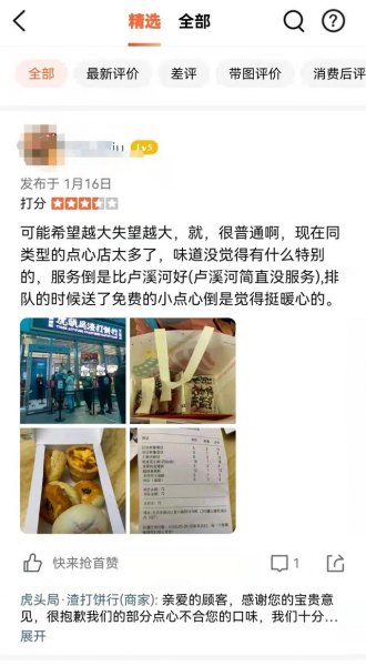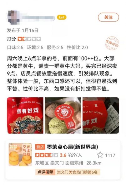 初来北京市场,墨茉点心局和虎头局同样出现排队现象,网友评价也是毁誉参半。2025年1月16日,有消费者在大众点评对墨茉点心局北京新世界店吐槽:“晚上6点半拿的号,前面有100多位,大部分都是黄牛,买完已经夜里9点。整体体验一般,东西口感还可以,但很容易找到平替,如果没有折扣觉得不值。”还有网友称,对虎头局“希望越大失望越大”,“现在同类型的点心店太多了,味道没觉得有什么特别的,服务倒是比泸溪河好,排队时送的免费小点心倒是挺暖心的”。