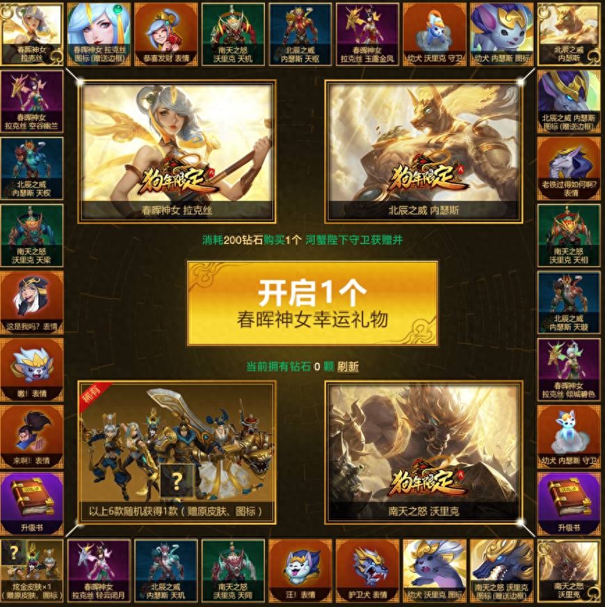 这项类似于老虎机一样的抽奖活动奖池也是十分的丰富,包括拉克丝,狗头,狼人的狗年限定皮肤,以及各自的炫彩,其他几款年限皮肤的金色炫彩,以及守卫眼,升级书,图标,表情等。