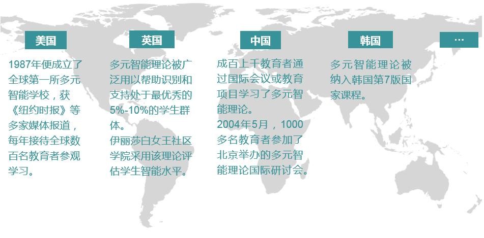 目前,多元智能正风靡美国及世界各地,出版了大量的有关多元智力方面的书籍和上千篇论文。在美国取名为“多元智能实验学校”或“加德纳学校”的已经有数百所。在台湾、香港、澳门等地,多元智能理论也引起了教育界及各个家长学校的广泛重视,台湾地区还专门组织了教师和家长们学习、研究和分享多元智能的有关成果。