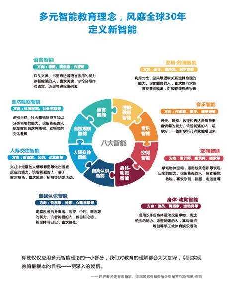 针对这种仅徘徊在操作层面,而未揭示智力全貌和本质的传统的有关智力的狭隘定义,多元智能理论定义智能是人在特定情景中解决问题并有所创造的能力。我们每个人都拥有八种主要智能:语言智能、逻辑一数理智能、空间智能、身体一动觉智能、音乐智能、人际交往智能、自我认识智能、自然观察智能。
