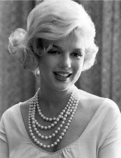 性格迷人的玛丽莲梦露经常会佩戴各式各样的项链和耳环,尤其喜欢三颗珍珠串成一条线的耳环,特别时髦。