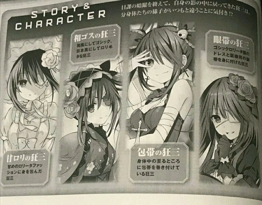 这里得说一说狂三的四大天王:萝莉狂三、和服狂三、眼罩狂三与绷带狂三。她们是狂三众多分身中最会搞事情的几位,每每总是让狂三尴尬不已,狂三自然是不愿意让别人知道她的这些事情。而21卷仅仅这一张彩插就把狂三的四大天王都给刻画了出来,分别是背后的白色的洛丽塔式雨伞,头上的和氏头饰,眼上的白色眼罩以及脖子上的绷带。看到这张彩插,其实我不禁想吐槽,狂三真是江山易改,本性难移!