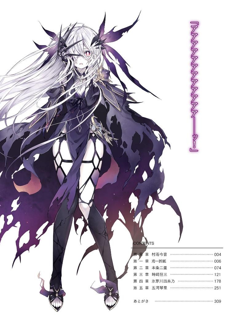 接着来看涉及章节目录的彩插。这张彩插透露的主要信息有三点,其一是第22卷就是完结的篇章,因为本篇故事中所出现的精灵就只有11位,以她们为章节标题,最多也只能排出一卷的篇幅来;其二是本篇故事的最后是会以每一位的精灵为主要角度来展开的;其三是四糸乃的姓得到曝光,她的全名为氷(bing)芽川四糸(si)乃,难读的程度又上升了一个等级,而不出意外的话,七罪应该也会在22卷中曝光自己的姓。