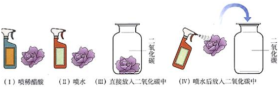 实验步骤:取四朵用石蕊溶液染成紫色的干燥的纸花。分别进行以下实验,观察四朵纸花的颜色变化。