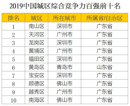 由赛迪发布的【2019全国城区综合竞争力百强排行榜】,为了迎合标题而简化了数据,挑了前10名的区,分别是南山区/天河区/龙岗区/黄埔区/福田区/黄岛区/宝安区/顺德区/越秀区/南海区,深圳4个,广州3个,佛山2个,青岛1个,更让人惊讶的是前10强广东独占9席。