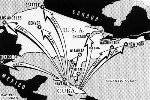 部署计划从1962年7月中旬开始实施:载有3500名军事技术人员以及导弹和核弹头的苏联舰船悄悄驶向古巴。这些核弹的威力要比广岛原子弹大25倍。为了不让美国方面发现,所以行动一直在秘密进行,然而天底下就没有不透风的墙。尽管苏联和古巴一直在秘密采取行动,然而1962年8月美国发现了苏联设在古巴的导弹发射场。这意味着苏联可以通过在古巴的导弹基地直接对美国本土形成威胁。