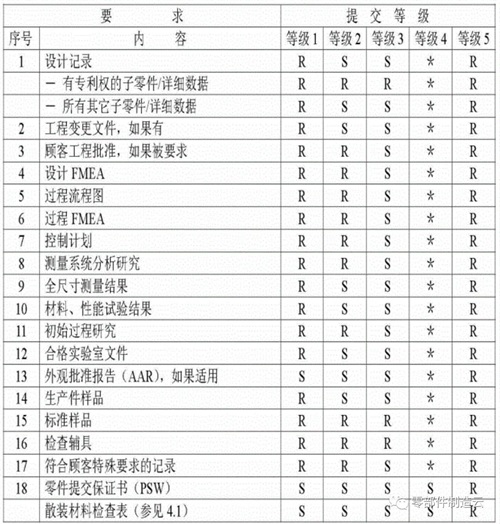 等级1:仅向顾客提交保证书(对指定的外观项目,提供一份外观批准 报告)。等级2:向顾客提交保证书和产品样品及有限的相关支持资料。等级3:向顾客提交保证书和产品样品及完整的相关支持资料。等级4:提交保证书和顾客规定的其他要求。等级5:保证书、产品样品以及全部的支持数据都保留在组织制造现场,供审查时使用。组织必须使用等级3作为默认等级,进行全部提交,除非经授权的顾客代表另有规定。