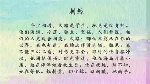 书评:男主和女主第一次相遇时是在游泳池,惊鸿一瞥下男主就心生悸动,女主当时还是学生,内心带着几分叛逆,游泳很厉害,像鲸鱼一样,第二次见面是因为女主失恋去纹身,要写上前男友的名字,纹身师刚好是男主。