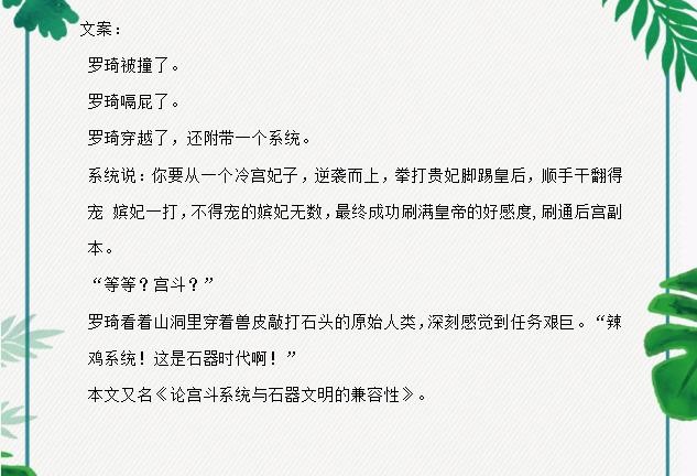 小w书评:脑洞满分,带着宫斗系统搞基建,女主穿越到原始社会,以仙女的身份狂忽悠,在各个宫斗大佬的帮助下带着原始人在基建的路上狂奔。制作陶罐、生产肥皂、织织网,石器时代各类生产工艺和生活水平开始飞跃,踏踏实实的搞基建,难得的没搞出黑科技。喜欢各路娘娘宫斗完开始编故事帮助女主装神棍,所有人和和气气的一起建设新家园,没有戾气,不搞事。作者考据,科普很有意义,本文男女皆宜,五星强推!