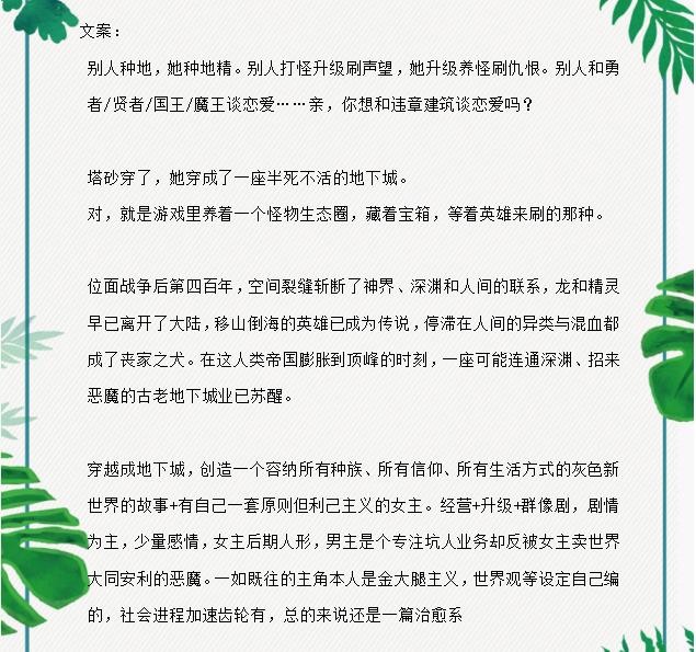 小w书评:西幻文,DND设定,女主穿成地下城,出于善意,开始基建,最后拯救了差点崩溃的异世界。男主是地下城之书,出镜很少但是出场带感,负责嘴炮卖萌。全文人物描写生动有趣,女主淡定从容,提倡种族平等,建立了一个偏乌托邦的世界,因为作者的立意总体给五星推荐。